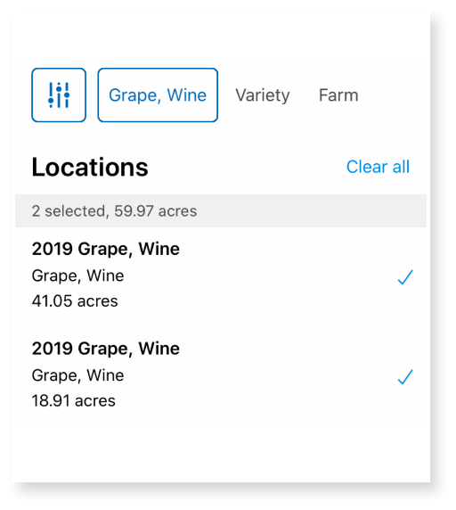 Here you can select your desired plantings. Filter by farm, commodity or variety. You can also quickly adjust the total area that the record applies to.